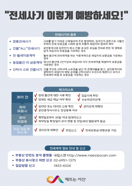 시에 따르면 전세 사기의 종류로 깡통전세 사기, 전·월세 이중계약, 동일 물건 이중~삼중 계약 등이 있으며 이를 방지하기 위해 계약 전 확인 사항을 강조했다.