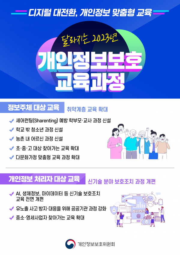 특히 인공지능, 생체정보, 마이데이터 등 최근의 개인정보 기술 동향을 반영해 신기술 분야 보호조치 과정을 개편하고 개인정보 유·노출 사고 방지·대응 등 공공기관 대상 교육과정도 강화한다.