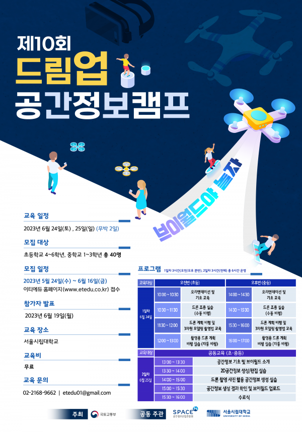 이번 제10회 드림업 캠프는 초·중학생을 대상으로 6월 24일부터 2일간 주말을 이용해 서울시립대학교 야외실습장과 공간정보 실습실에서 진행되며 드론 시뮬레이터를 통한 비행실습과 3차원 공간정보 제작뿐만 아니라 지도 제작 실습 등이 포함되어 작년보다 풍성한 프로그램을 마련했다.