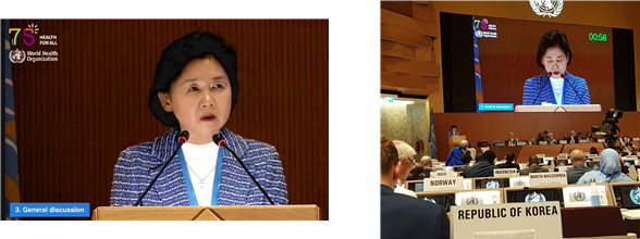 이후 ‘세계보건기구 75주년: 생명을 구하고 모두에게 건강을 제공’ 이라는 주제로 각 회원국 수석대표 기조연설이 진행됐으며 지영미 질병관리청장은 우리 측 수석대표로 발언했다.