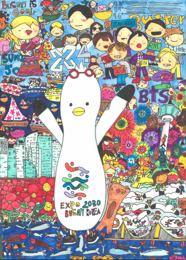 포스터 부문 대상 수상작인 ‘모두의 부산, 희망의 부산’은 부산시 소통 캐릭터 ‘부기’와 엑스포 홍보대사 BTS, 부산의 상징인 갈매기, 동백꽃 등을 소재로 엑스포 유치를 희망하는 마음을 표현했다.