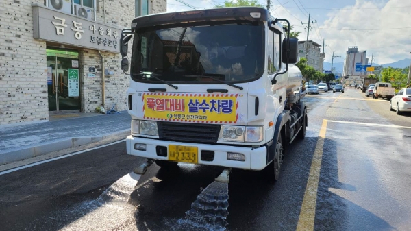 폭염이 심한 6~8월 중 상황에 따라 읍·면소재지 주요도로 및 교차로 등에서 살수차 5대를 임차해 12개 노선 17.6km를 일 4회 운영할 예정이다.