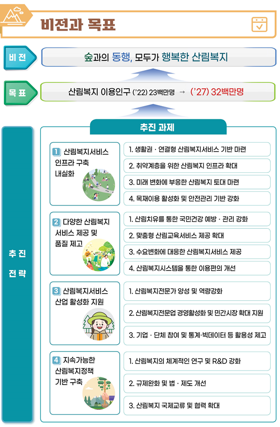 [세종타임즈] 산림청은 “숲과의 동행, 모두가 행복한 산림복지”를 비전으로 2027년까지 산림복지서비스 이용인구 32백만명을 목표로 제2차 산림복지진흥계획을 수립하고 본격적으로 추진한다고 밝혔다.