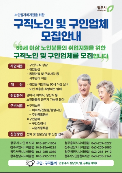 또한 시는 양질의 민간일자리 발굴을 위해 청주흥덕시니어클럽 등 노인일자리 지원기관 6개소에 민간일자리 발굴단을 구성해 60세 이상 구직노인과 구인업체를 상시 모집하고 있으며 구직노인을 위한 취업지원서비스도 제공하고 있다.