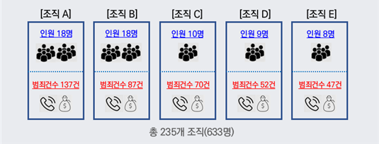 2명으로 구성된 범죄조직이 160개로 가장 많았고 가담자 규모가 가장 큰 조직은 18명에 이르는 것으로 나타났다.