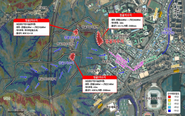 점골지구는 2016년 10월 태풍 ‘차바’로 인해 주택과 상가 145동의 침수피해가 발생한 지역으로 행안부의 선정 절차를 통해 우수유출저감시설 설치사업의 신규지구로 2023년 4월 초 선정됐으며 2024년부터 저수지와 하류부 수로 정비 등 보강사업을 추진하게 된다.