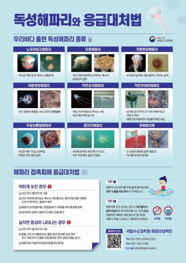 해양수산부는 해파리로 인한 어업피해와 해수욕장 쏘임 사고를 예방하기 위해 사전 모니터링부터 사후 복구 지원까지 단계별 대책을 마련하고 선제적으로 대응해 나갈 계획이라고 전했다.