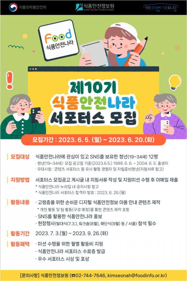 [세종타임즈] 식품의약품안전처와 식품안전정보원은 국민의 눈높이에 맞는 식품안전 정보 콘텐츠를 제작·홍보할 ‘제10기 식품안전나라 서포터스’를 6월 5일부터 6월 20일까지 모집한다.