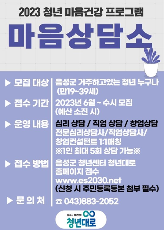 모집 기간은 예산 소진 시까지 상시 모집하며 만19세 이상 만39세 이하 음성군 거주 청년에게 창업 상담, 직업상담, 심리상담의 분야별 전문 컨설턴트 또는 전문상담사를 연계한다.