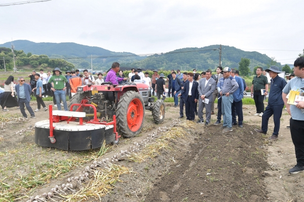시는 난지형 마늘 수집형 수확기 신기술 시범사업 추진현황 보고에 이어 마늘 줄기 절단, 수집형 수확기 수확 작업 시연 행사를 가졌다.