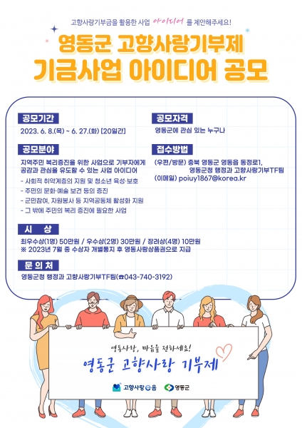 [세종타임즈] 충북 영동군은 영동발전을 이끌고 주민 복지수준을 높일 고향사랑기부제 기금사업 아이디어 공모를 실시한다고 9일 밝혔다.