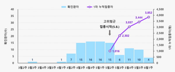 고위험군 대상 접종은 총 131개 기관에서 실시중이며 6.11일까지 1차접종은 누적 3,852명이고 2차 접종은 248명이 접종 완료했다.