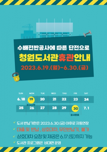 상호대차 서비스 요청 및 제공은 6월 17일까지 가능하며 이후에는 단전으로 인해 휴관 기간 동안 대출 및 반납, 무인반납기, 상호대차 서비스는 중단되고 반납기한은 6월 30일 이후로 자동 연장된다.