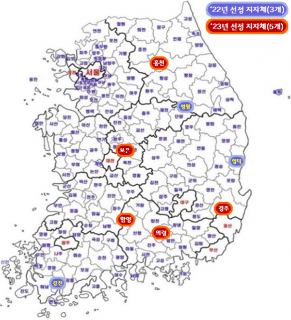 선정된 지자체는 강원도 홍천군, 충청북도 보은군, 경상북도 경주시, 경상남도 의령군, 경상남도 함양군 등 5곳이며 서면심사와 현지실사 등을 거쳐 선정됐다.