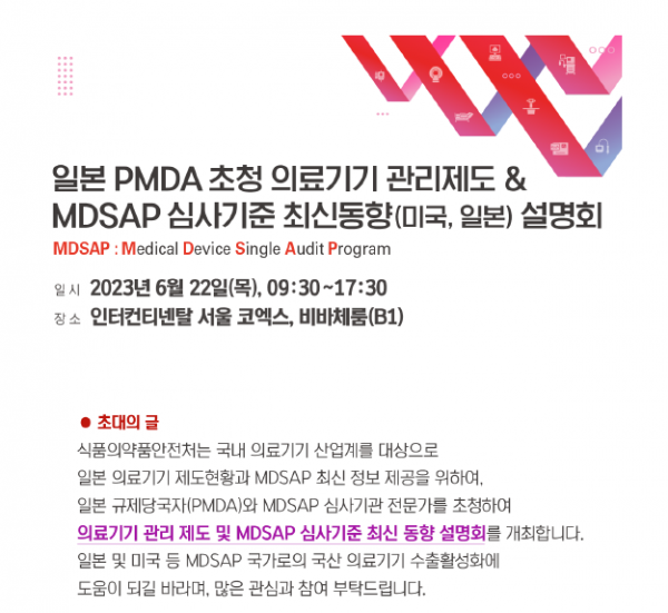 이번 설명회는 ➊오전에 MDSAP 의장국인 일본의 규제당국을 초청해 일본의 의료기기 GMP 제도와 사후감시 제도 일본의 MDSAP 최신동향과 활용 방안을 소개하고 ➋오후에 MDSAP 지정 심사기관의 심사원이 미국·일본에서 MDSAP 관련 심사대응 요령을 안내한다.