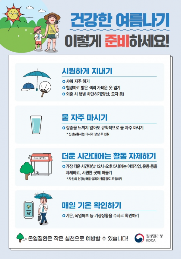 폭염으로 인한 건강피해는 작은 실천으로도 예방이 가능하므로 시원하게 지내기, 물 자주 마시기, 더운 시간대에는 활동 자제하기 등 건강수칙을 준수하는 것이 중요하다.