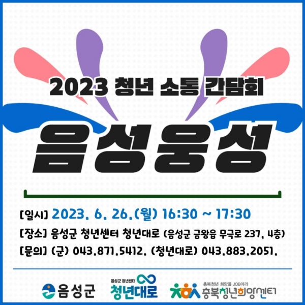 [세종타임즈] 음성군은 26일 음성군 청년센터 청년대로에서 청년들이 겪고 있는 다양한 고민과 문제의식을 공유하고 청년들이 가진 군정에 대한 건의사항을 청취하기 위해 청년소통간담회 ‘2023 청년 음성웅성’을 개최한다.