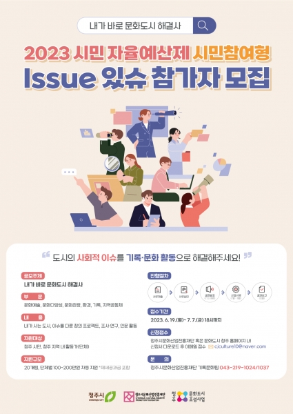 [세종타임즈] 2023년에도 시민이 바로 문화도시 청주의 해결사 청주시와 청주시문화산업진흥재단 문화도시센터가 오는 7월 7일 오후 6시까지 시민참여형 프로젝트 ‘2023 시민 자율예산제 시민참여형 Issue있슈’에 함께할 시민을 모집한다고 밝혔다.