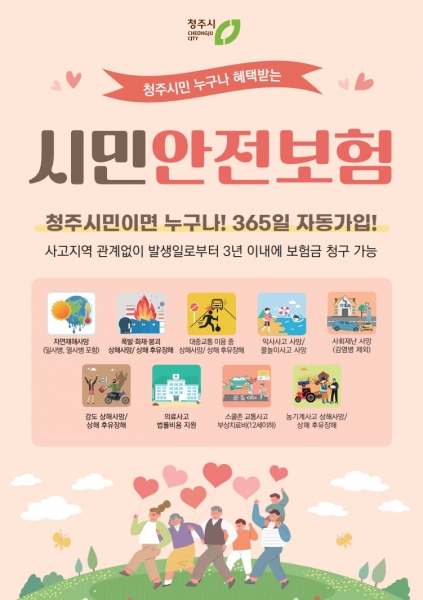 올해는 ‘사회재난 사망’ 항목이 추가돼 지난 6월 1일부터 새롭게 갱신해 시행하고 있으며 보험료는 청주시가 전액 부담한다.