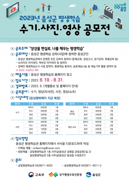 ‘상상을 현실로 나를 채우는 평생학습’이라는 주제로 진행되는 이번 공모는 수기, 사진, 영상, 영상 4개 부문으로 나뉘어 진행되며 음성군 평생학습 강좌에 참여한 음성군민이면 참여가 가능하다.