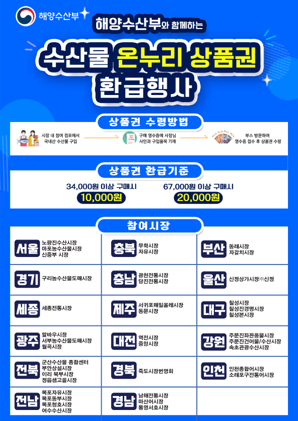 [세종타임즈] 해양수산부는 6월 22일부터 6월 25일까지 4일간 ‘대한민국 수산대전–온누리상품권 환급행사’를 개최한다.