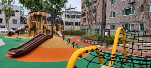 이용률이 낮은 배드민턴장 공간을 어린이를 위한 연령별 맞춤형 놀이기구로 조성했으며 아이들을 지켜보며 쉴 수 있는 그늘 쉼터와 어른들을 위한 운동기구를 설치하고 수목 전정 및 맥문동, 수호초, 나무수국 등 초화류 등을 식재했다.