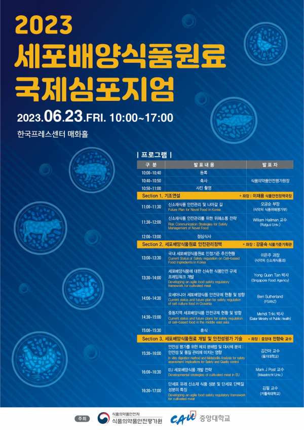 심포지엄 주요 내용은 국외 주요국의 세포배양 식품원료에 대한 안전성 규제와 제품 개발 등과 관련된 최신 연구 동향 등이다.