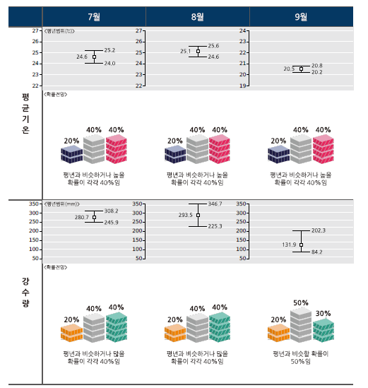 기상청 현업 기후예측모델뿐만 아니라 미국, 영국 등 전 세계 11개 기상청의 471개 기후예측자료를 분석한 결과, 기온은 평년보다 높을 확률이 56~63%에 달하고 강수량은 평년보다 많을 확률이 39~47%로 나타났다.