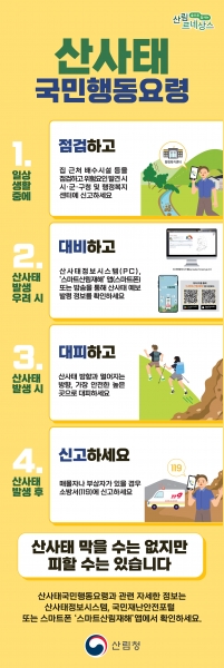 산사태 국민행동요령과 관련한 자세한 내용은 산사태정보시스템, ‘스마트산림재해’ 앱 또는 국민재난안전포털을 통해 국민 누구나 확인할 수 있다.