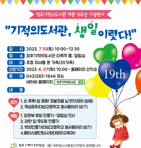 시 관계자는 “지역의 어린이들과 함께 성장해 온 청주기적의도서관이 19번째 생일을 맞아 어린이와 가족을 위해 다채로운 프로그램을 준비했다”며 “도서관이 지역주민을 위한 소통과 문화의 공간으로서 역할을 하고 지역사회 내 도서관을 재인식 시킬 수 있는 좋은 기회가 될 것이다”고 말했다.