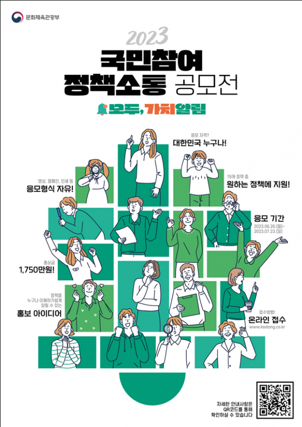[세종타임즈] 문화체육관광부는 국민에게 필요한 정책을 국민이 직접 알리는 2023 국민참여 정책소통 공모전 ‘모두, 가치알림’을 진행한다.