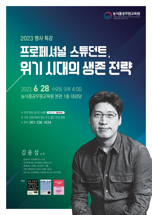 [세종타임즈] 농식품공무원교육원은 6월 28일 오후 4시, 본관 1층 대강당에서 교육생과 농식품부 소속 공무원 및 인근 공공기관 임직원 등 300여명을 대상으로 ‘명사 특강’을 개최한다.