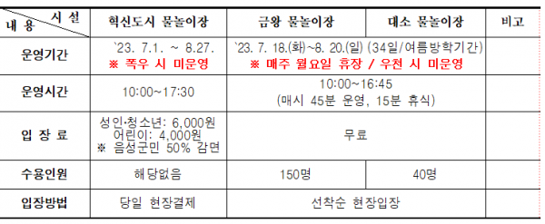 군은 올해 물놀이장 관련 조례를 제정하고 물놀이장 전문업체를 선정해 7~8월 56일 동안 도심 속 휴양지로의 역할을 톡톡히 할 수 있도록 만반의 준비를 마쳤다.