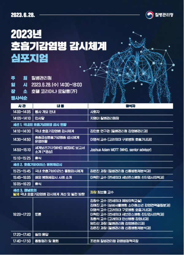 [세종타임즈] 질병관리청은 6월 28일에 국내 호흡기감염병 감시체계 발전 방안 마련을 위한 ‘2023 호흡기감염병 감시체계 심포지엄’을 개최한다고 밝혔다.