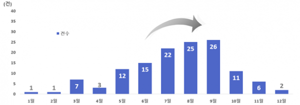 최근 5년간 살모넬라로 인한 식중독은 총 131건 발생했고 환자 수는 7,400명이었으며 이 중 6월부터 9월까지가 전체 발생의 67%을 차지하는 것으로 분석됐다.