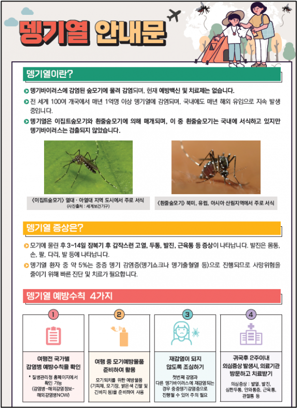 [세종타임즈] 질병관리청은 우리나라 국민이 여행지로 선호하는 동남아시아에서 뎅기열 발생이 유행 중에 있고 여름 휴가 등 해외여행으로 국내유입 위험 증가가 예상됨에 따라 검역단계에서 뎅기열 선제검사로 감시를 강화하겠다고 밝혔다.