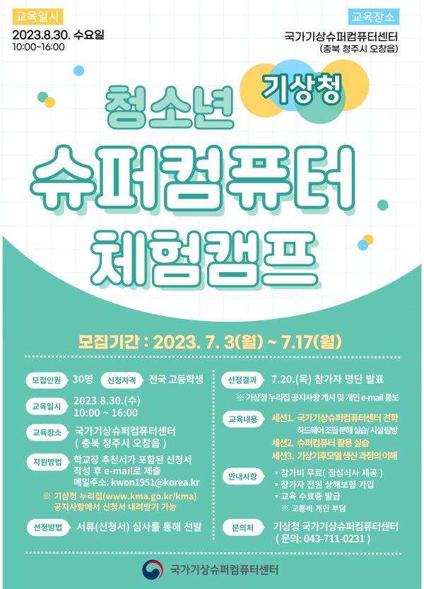 [세종타임즈] 기상청은 7월 3일부터 7월 17일까지 전국 고등학생을 대상으로 ‘청소년 슈퍼컴퓨터 체험캠프’참가자를 모집한다고 밝혔다.