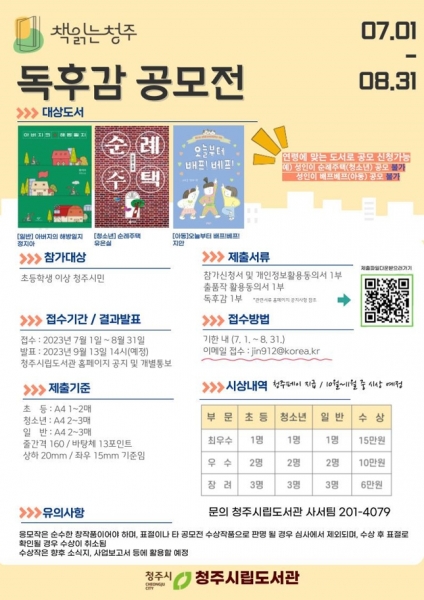 청주시립도서관 홈페이지에서 참가신청서를 내려 받아 작성한 뒤 독후감과 함께 오는 8월 31일까지 이메일로 제출하면 된다.