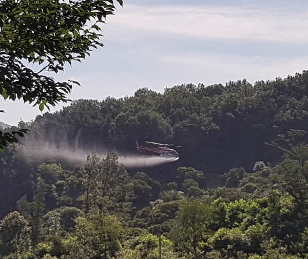 시는 산림청 헬기 2대를 지원받아 밤나무 종실에 집중적으로 발생하는 복숭아명나방 등의 종실성 해충에 대해 집중 방제하고 있다고 밝혔다.