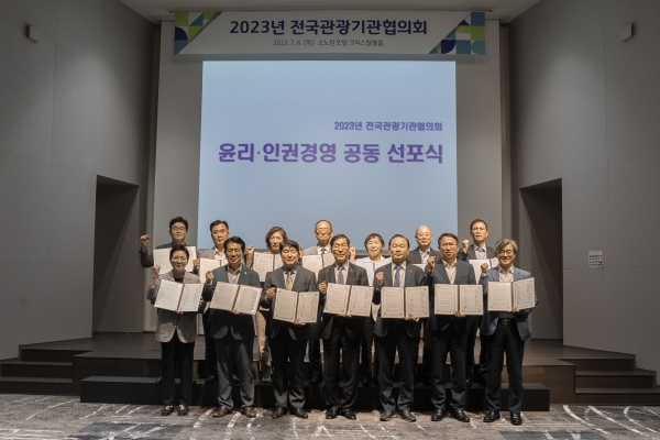 [세종타임즈] 한국관광공사와 전국 15개 지역관광공사·관광재단 협의체인 ‘전국관광기관협의회‘는 오늘 경기도 고양 소노캄호텔에서 ’윤리·인권경영 공동 선포식‘을 개최했다.