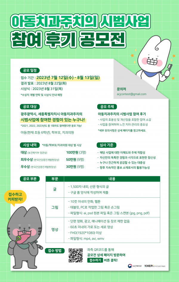 이지은 보건복지부 구강정책과장은 “이번 공모전을 통해 사업참여 아동과 학부모 및 치과의원의 생생한 현장 목소리를 듣고 서비스를 개선하는데 노력하겠다”며 “앞으로도 다양한 교육 및 홍보 콘텐츠를 통해 구강관리 문화를 확산하겠다”고 밝혔다.