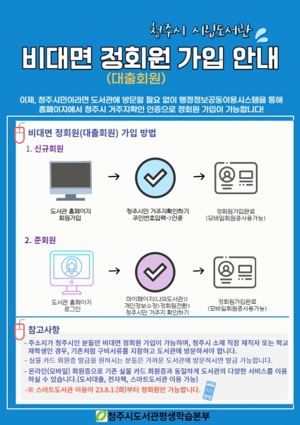 온라인으로 도서관 정회원 가입을 원하는 시민은 청주시 시립도서관 홈페이지에서 회원가입한 뒤 ‘청주시 거주지 확인’서비스를 통해 청주시 거주를 확인한 뒤 정회원 가입이 가능하다.