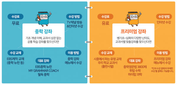 ‘EBS 중학 프리미엄’은 현재 무료로 제공되고 있는 EBS 출판 교재 기반의 ‘EBS 중학’ 강좌와 달리 교과서 시중 유명교재 기반으로 제작·서비스하고 있는 EBS 유료 교육 서비스이다.