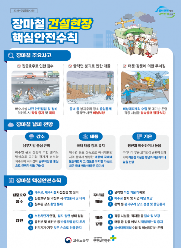 집중호우 시에는 대규모 재난을 야기하는 지반·시설물 붕괴 및 침수로 인한 감전 등 재해가 발생할 수 있어, 고용노동부는 각 사업장에 붕괴·감전·강풍 등 장마철 위험요인을 안내하고 현장을 방문해 지도하고 있다.