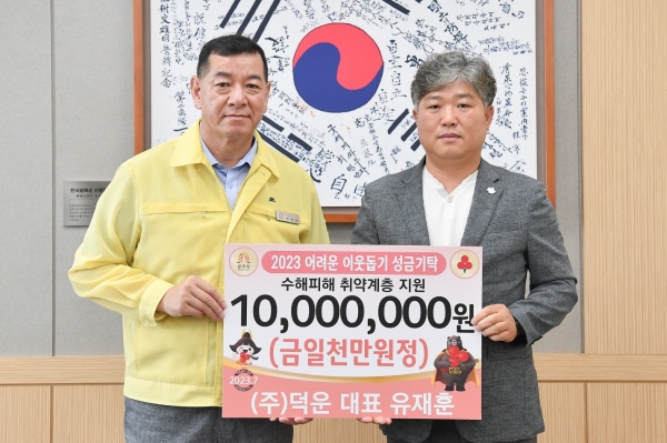 ㈜덕운 유재훈 대표이사는 최근 집중호우로 인해 공주지역의 피해 상황이 심각하다는 소식을 접하고 취약계층을 위해 사용해 달라며 성금 1천만원을 전달했다.