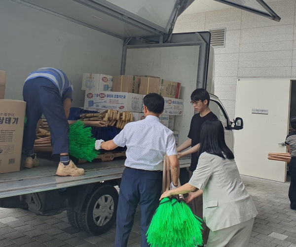 이날 신청주코퍼레이션은 수해 복구를 위해 조금이나마 도움이 되길 바란다며 자신의 회사에서 만든 삽 192개, 빗자루 70개, 쓰레받이 120개 등을 제공했다.