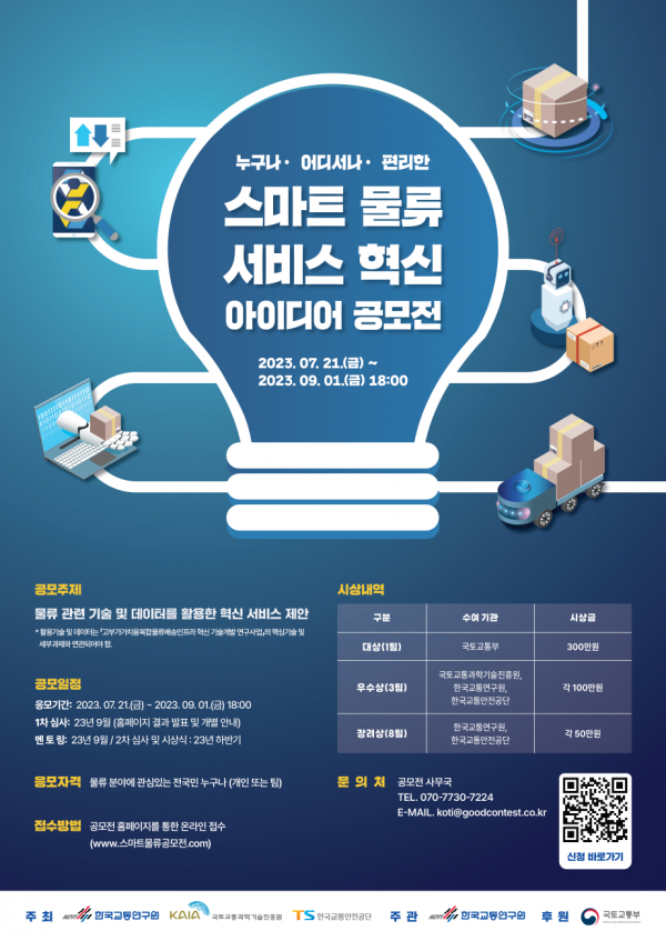 이번 공모전은‘스마트 물류인프라 구축’을 위해 연구개발 중인‘고부가가치융복합 물류배송인프라 혁신기술개발 연구사업’에 접목할 수 있는 아이디어를 발굴하고자 마련됐으며 생활물류 스마트 배송인프라, 물류 정보 플랫폼 구축 분야의 핵심기술과 세부과제, 데이터 수집·연계 등 10개 과제에 대한 아이디어를 모집한다.