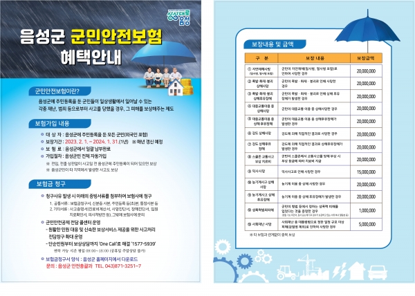 군민 안전 보험은 사고를 당했을 경우 음성군과 계약이 체결된 보험사를 통해 보험금을 지급 받을 수 있는 제도로 수혜 대상은 모든 군민이다.