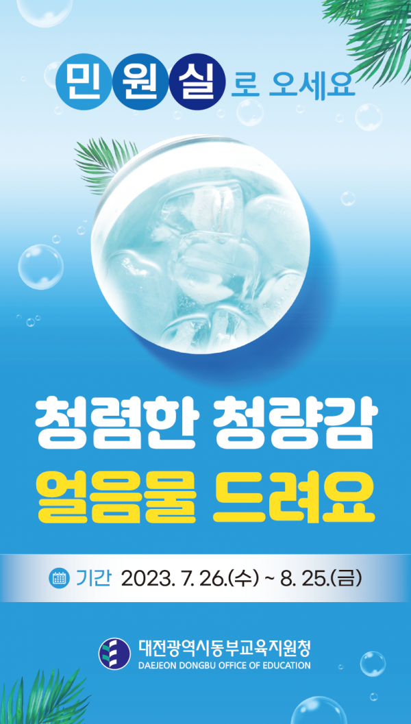 대전동부교육지원청 민원실에서는 청사 1층 민원실에 냉장 및 냉동 보관한 생수를 비치해 해당 기간 청사를 방문하는 민원인에게 제공할 예정으로 이 기간 업무시간 중 대전동부교육지원청 청사를 방문하는 민원인이라면 누구나 민원실에서 시원한 생수를 받을 수 있다.
