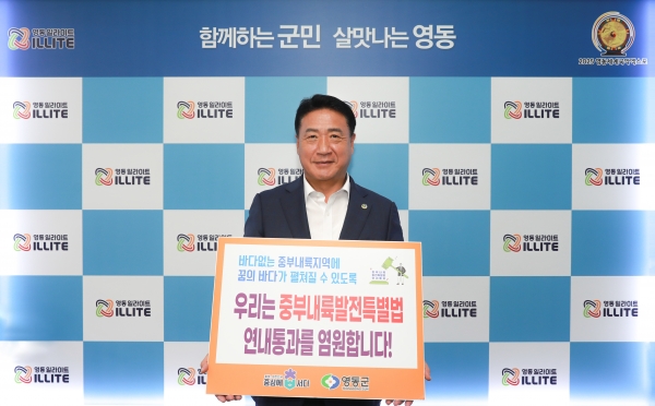 [세종타임즈] 정영철 영동군수가 지난 25일 중부내륙발전특별법 연내 제정 촉구를 위한 ‘중부내륙발전특별법 연내통과 염원’ 릴레이 캠페인에 동참했다.
